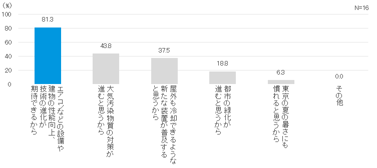 令和の東京の夏の空気を「不快になる」と考える人が多い一方で、少数ではあるものの20~30歳代を中心に「快適になる」と考える人も存在しています。それらの人に「令和の東京の夏の空気が快適になると思うのはなぜですか」と聞いたところ、最も多かったは「エアコンなどの設備や建物の性能向上、技術の進化が期待できるから」(81.3%)でした(図9)。若い世代はAIやIoTによるイノベーションを身近なものとして感じていることもあり、令和の夏もエアコンをはじめとする空調機器や建物の進化を通じて快適に過ごせる、過ごしたいという前向きな願望を込めて答えてくれたのかもしれません。