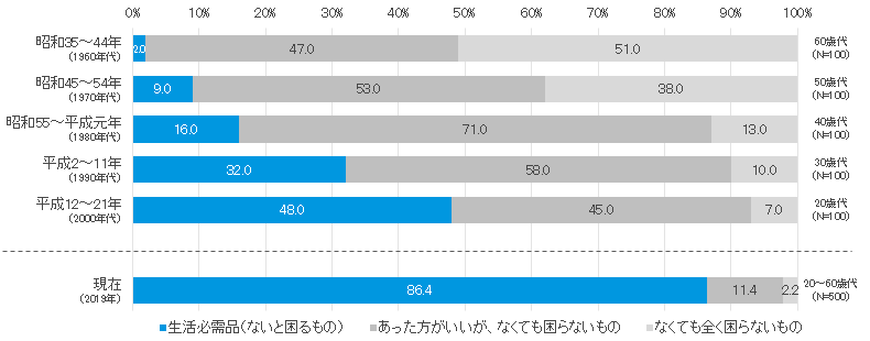 初めてエアコンがついた際に家族にとって特別な存在だったエアコンですが、その存在感は時代とともにどのように変化しているのでしょうか。「東京の夏を過ごす上で、エアコンはあなたにとってどんな存在ですか」という設問で、現在と小学生の頃(10歳頃)のエアコンに対する認識を聞き、昭和から令和までの変遷をたどりました。その結果、エアコンは昭和35~44年には98.0%が「なくても困らないもの」(「なくても全く困らないもの」と「あった方がいいが、なくても困らないもの」の計)と考えられていましたが、現在(2019年)は「生活必需品(ないと困るもの)」が約9割(86.4%)を占め、東京の夏を過ごす上でエアコンはなくてはならない生活インフラとして存在していることが分かりました(図11)。