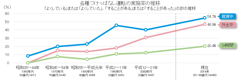 エアコンが普及し、東京の夏が変化する中でエアコンの存在感が変わってきたように、エアコンの省エネ性、機能性の向上に伴い、その使い方にも変化の兆しが見られます。夏場のエアコンのつけっぱなし運転について、「夏場のエアコンの使い方としてつけっぱなし運転をすることがありましたか」と、「就寝時」、「短時間の外出中」、「24時間」の3つについて、小学生の頃(10歳頃)と現在における実施経験の有無を聞き、昭和・平成・令和における変遷をたどりました。その結果、いずれのつけっぱなし運転も平成2年(1990年)頃から増え始め、現在、就寝時のつけっぱなし運転の実施率は54.7%、短時間の外出中のつけっぱなし運転は46.9%に達していることが分かりました(図12)。24時間のつけっぱなし運転の実施率は20.4%とそれほど高くはありませんが、他のつけっぱなし運転が増えていることから考えると、その実施率は今後増えていくものと推測されます。