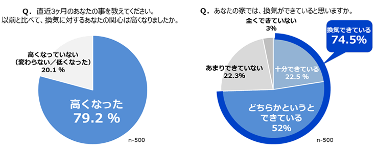 「直近3カ月で、換気に対する関心は高くなりましたか」という質問に対して、79.2%の人が「高くなった」と回答しました。また、「換気ができているか」という質問に対して、74.5%の人が「十分できている」「どちらかというとできている」と回答し、コロナ禍での「換気」への関心の高さがうかがえる結果となりました。