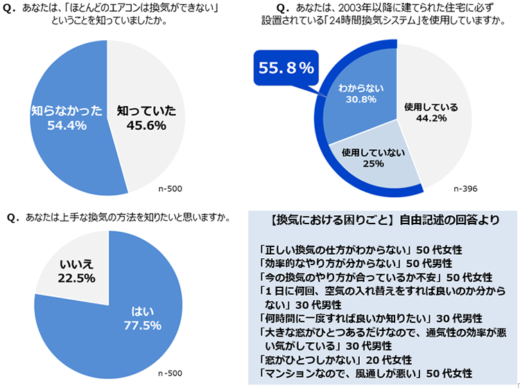 その一方で、24時間換気システムを「使用していない」あるいは「わからない」人が55.8%、「ほとんどのエアコンは換気ができない」ということを知らなかった人が54.4%いました。また、77.5%の人が「上手な換気の方法を知りたい」と回答し、換気に関する困りごとについての自由記述の回答では「正しい換気の方法がわからない」「今の換気のやり方が合っているか不安」という声があがりました。あらためて「上手な換気の方法」を正しく伝えることの重要性が浮き彫りとなる結果となりました。