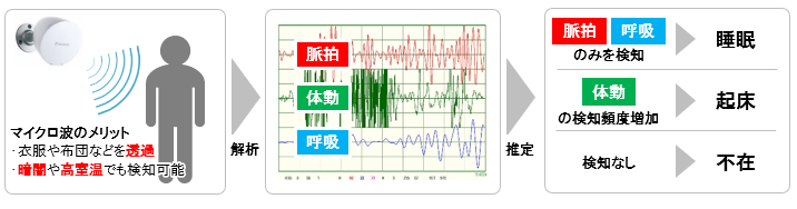 本商品は、動きに反応するドップラーセンサーにより、室内の人の在否や就寝・起床の状況を検知・解析します。こうした情報は約10分ごとに更新され、離れた場所からでも専用のスマートフォンアプリで確認できるため、単身高齢者の生活リズムの変化を把握できます。また、当社のルームエアコン※1との連携により、人の在室時に室温が高くなれば自動で冷房運転を開始し、就寝を検知すれば睡眠に適した運転に自動で切り替えます。こういった機能が搭載されていない機種でも、室温の変化に気付きづらい高齢者の暑さ対策や快眠の補助に活用できます。