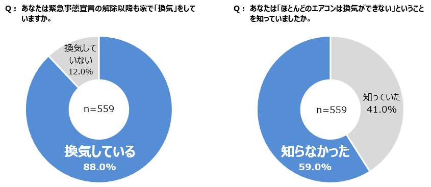 その一方で「ほとんどのエアコンは換気ができないということを知っていましたか」という質問に対して、「知っていた」と回答したのは41.0%で、59.0%の人は「知らなかった」と回答しています。換気に関する行動と知識の間には少しギャップがあるといえそうです。