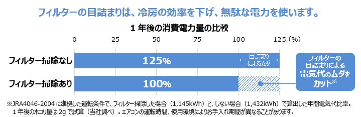 エアコンは部屋の暖かい空気を吸いこんで、冷たい空気にして吐き出すことで、部屋を涼しくしています。エアコン内部のフィルターが目詰まりすると、吸いこむ空気の量が少なくなり、部屋を冷やす力が小さくなるため、部屋を冷やすのに多くの電力が必要になります。1年間フィルター掃除をしないと、消費電力が約25%も増加します。