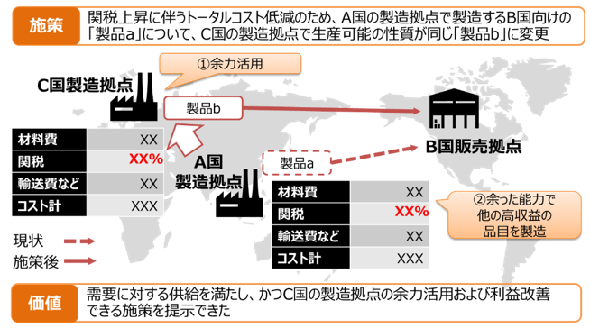 その結果、ボトルネック工程の設備稼働率と生産能力向上に伴う人員コストに着目した増産施策や、利益を最大にする調達・生産・販売経路の変更施策など、KPIに寄与する製造・販売施策や、現場制約が加味された実行可能な生産計画を、自動で複数パターン提示することが可能になりました。これにより、製造・販売施策のタイムリーな立案と迅速な意思決定が可能になるとともに、需給調整や施策立案に携わる担当者はお客さま起点のSCM施策や事業計画の検討・実行に一層注力できるようになります。