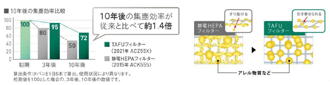 こうした背景の中、当社は、潜水艦内の細菌の増殖を抑制するために開発された抗菌技術を業界で初めて※2空気清浄機に応用した「抗菌加湿フィルター」を開発し、従来からの「ストリーマ」や「銀イオンカートリッジ」と組み合わせた、より清潔な加湿運転を追求しました。さらに、『うるるとさらら空気清浄機』『加湿ストリーマ空気清浄機(ハイグレードタイプ)』にのみ採用していた「TAFUフィルター」を『加湿ストリーマ空気清浄機(スリムタワータイプ)』『ストリーマ空気清浄機(コンパクトタイプ)』にも搭載することで、従来のHEPAフィルターと比較し、10年使用後の集塵効率を約1.4倍※3にアップさせました。また、『業務用ストリーマ空気清浄機』には、0.3μmの微小粒子を99.97%※4捕集する性能を持つ「静電HEPAフィルター」を採用しました。