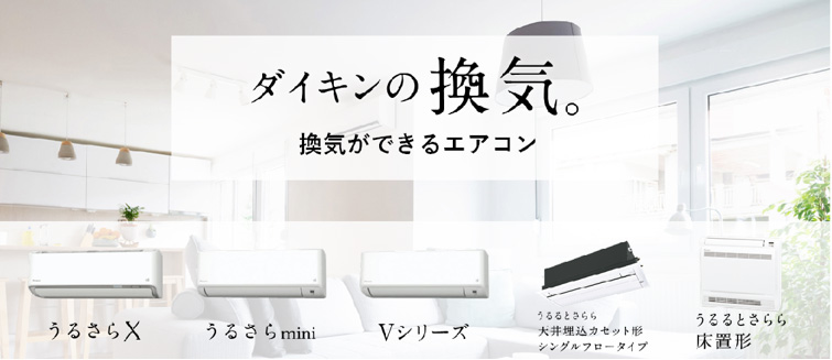 ダイキン工業株式会社は、リビングルームから個室まで、部屋に応じて選べる換気機能※1(給気方式)付きルームエアコン5商品を発売します。当社独自※2の換気しながら加湿※3・暖房できるフラッグシップモデル『うるさらX(エックス)』、加湿に加え新たに換気機能を搭載した『うるさらmini(ミニ)』を11月1日より発売します。また、換気運転が可能なスタンダードモデル『Vシリーズ』を新たにラインアップし、2021年3月30日より発売します。併せて、他の3商品同様、リモコンの「換気ボタン」を押すだけで換気ができるルームエアコン『うるるとさらら天井埋込カセット形シングルフロータイプ』や『うるるとさらら床置形』を2021年3月30日より発売します。