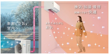 当社の「換気ができるエアコン」は、室外機から取り込んだ外気を搬送ホースで室内機に運びます。室内機に送られた外気は、室内機が室内から吸い込んだ空気とともに熱交換器を通り、温調されて室内に届けられるため、冬場は換気しながら暖房、夏場は換気しながら冷房することができます。さらに『うるさらX』『うるさらmini』『うるるとさらら天井埋込カセット形シングルフロータイプ』『うるるとさらら床置形』は当社独自※6の無給水加湿機能搭載により、換気しながら加湿・暖房することも可能です。