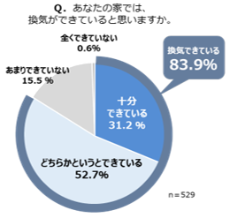 「あなたの家では、換気ができていると思いますか」という質問に対して、「十分できている」31.2%、「どちらかというとできている」52.7%と、自宅で「換気できている」と考えている人は83.9%にのぼりました。