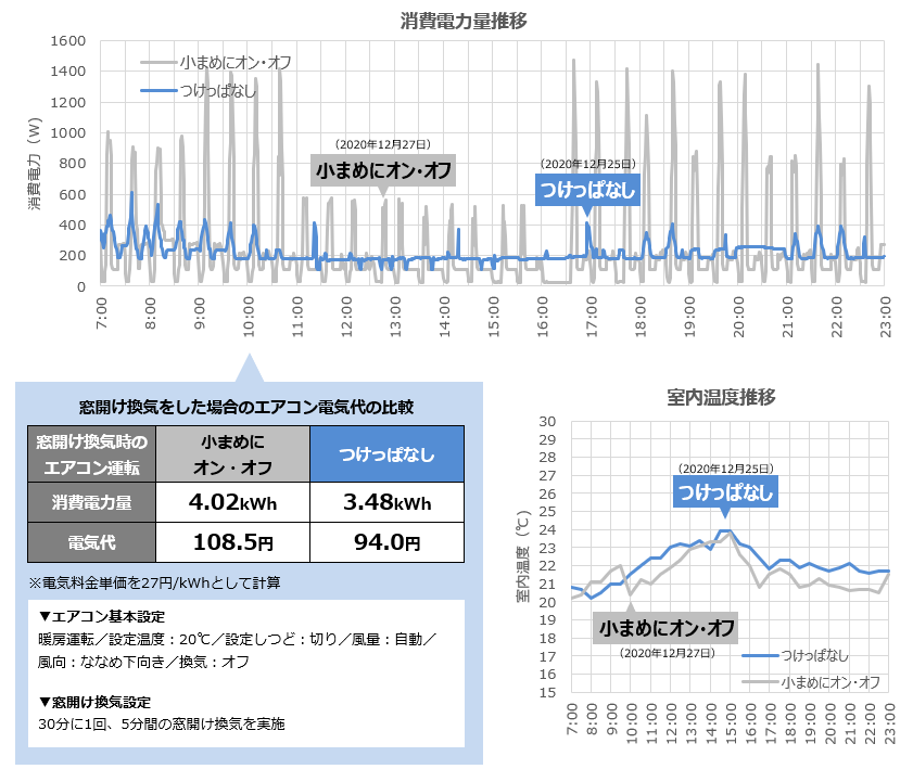 | 結果 | 冬に窓開け換気をする場合、エアコンをつけっぱなしにした方が、小まめにオン・オフするより消費電力量が少なくなり、電気代が1日で約14.5円下がりました。 | |