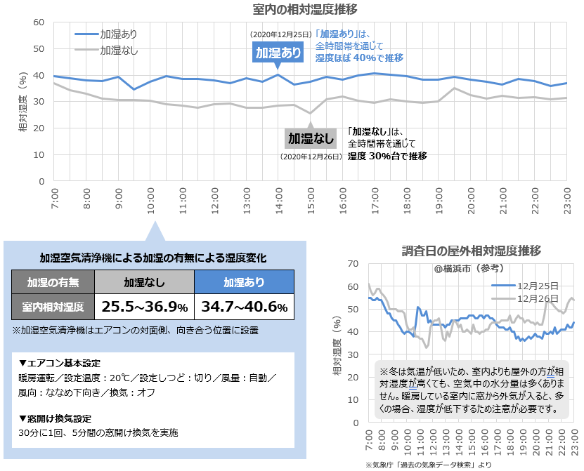 | 結果 | 冬に窓開け換気をする場合、「加湿なし」では湿度30%台の時間帯が続くのに対し、「加湿あり」では湿度40%にほぼ保たれました。 | |