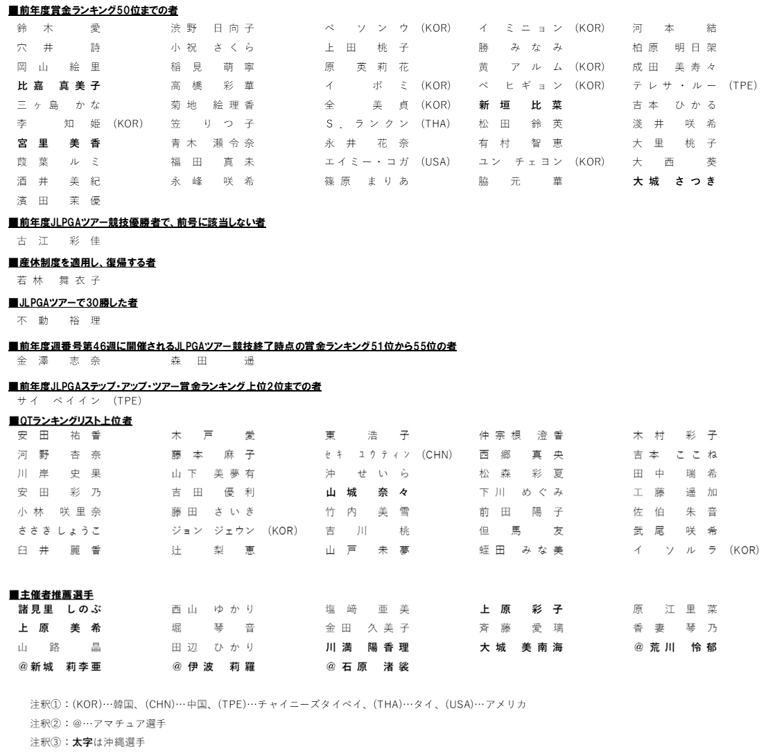 今大会には前回大会(2019年)で宮里藍以来、15年ぶりに沖縄県勢優勝を飾った比嘉真美子をはじめ、2019年賞金女王の鈴木愛、2019年全英女子オープン制覇に続き2020年全米女子オープンでも優勝争いを演じた(4位)渋野日向子などの実力者が揃って出場いたします。