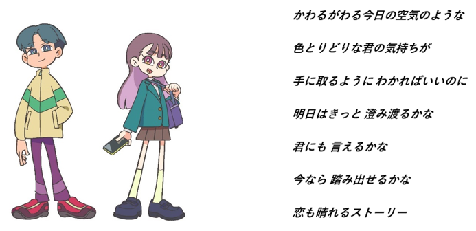 主な視聴者層に近い高校生の男女を主人公に、「ぴちょんくん天気予報」が身近にある世界を描いたアニメーションです。高校2年生で同じクラスの潤(じゅん・男)と爽楽(さら・女)。二人の生活の中にはいつも「ぴちょんくん天気予報」があり、それがきっかけとなって二人の距離を縮めていくストーリーとなっています。軽快なミュージックとアニメの世界観を表した歌詞が、明日への期待感を演出します。
