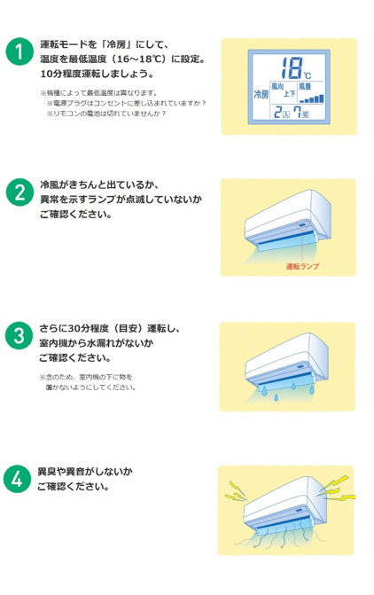 例年、エアコンのお問い合わせや点検のご依頼は、エアコンを使い始める6月頃から増え始め、7月、8月に集中します。混雑により暑い時期に修理対応をお待ちいただく場合があるため、本格的に暑くなる5月~6月前半に試運転を行い、早めにエアコンの準備を済ませていただくことをご提案しています。