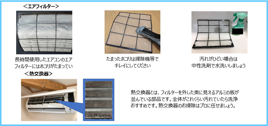 エアフィルターや熱交換器の汚れが過多となっている場合、においや振動が原因で異音に至るケースもあります。ぜひチェックをお願いします。