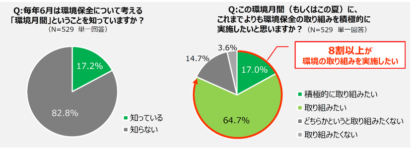 この環境月間ですが、人々の間ではどの程度認知されているのでしょうか。今回の調査では、「環境月間」を知っていると回答した人は2割(17.0%)に留まり、まだまだ環境月間が認知されていないことが明らかになりました。一方、この環境月間(この夏)に、これまでよりも環境の取り組みたいと回答した人は8割以上に達し、社会的には環境に対する関心が高まっているという結果になりました。