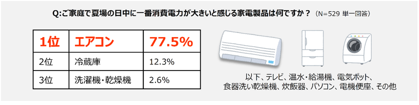 また「夏場の日中、一番消費電力が大きいと感じる家電製品は何ですか?」という質問に対して、最も多い回答となったのは「エアコン(77.5%)」でした。ご家庭での電力使用シーンにおいて、エアコンへの関心が高いと考えられます。
