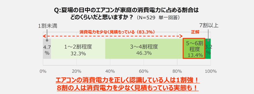 資源エネルギー庁の調査によると、夏の日中(14時ごろ)の一般家庭における電力消費は照明や冷蔵庫を抑え、エアコンが最大(58%)であると言われています。これに対し、エアコンの消費電力の割合を「5~6割程度」と正しく回答できた人は、わずか1割強(約13%)であり、8割以上の人は、エアコンの消費電力を少なく見積もっている実態も明らかになりました。エアコンと消費電力について正しい知識を身に着け、個人が小さな工夫を積み重ねることが、環境保護のためには必要なのかもしれません。