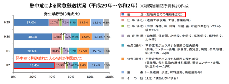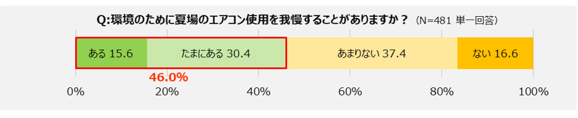 多くの人が環境に対して積極的である中、「環境のためにエアコン使⽤を我慢することがありますか︖」の問いに約半数(46%)の方が「ある」「たまにある」と回答しました。エアコンの使い過ぎを控えることは、環境貢献にもつながりますが、室内が暑くなると熱中症のリスクも高まります。消防庁の調査によると、熱中症で搬送された方の4割以上は住居にいたとのデータもあります。「設定温度を上げる」以外の省エネ対策も実践していただき、電気代、環境影響を抑えながら、この夏を快適に過ごしていただきたいと思います。
