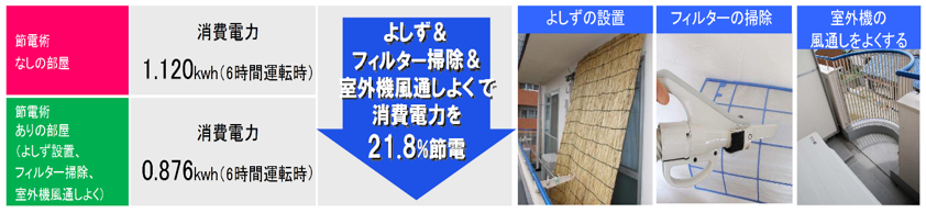 上記の回答にもあったエアコンの設定温度を1℃上げると、約10%の省エネ効果が期待できると言われています。またダイキンが過去に実施した実験では、窓に日よけ(よしず)を設置する、フィルターを掃除する、室外機のまわりの物を片付けるといった対策を実施することで20%以上の省エネ効果があるという結果になりました。消費電力が多くなりがちなエアコンですが、この環境月間はいろいろと試していただきたいと思います。