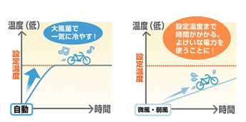 電気代節約のためと微風や弱風運転に設定している方がいますが、エアコンで電力を消費するのは、電源を入れてすぐの時など設定温度に向けて温度を上げるもしくは下げているとき。設定温度に達した後、室温を維持する時に使う電力は実は少なめです。微風や弱風は、設定温度に達するまでに時間がかかり、無駄な電気代がかかってしまうこともあるので、風量は「自動」にしておくことが一番効率良い方法です。