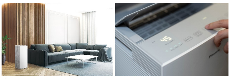 室内の空気質への関心が高まる中、空気清浄機にはこれまで以上に設置のしやすさや生活の邪魔にならない運転音などが求められています。本商品では、本体の構造・部品の配置を新規に見直すことで、設置面積を約13%低減。また、ワイドな吹出口の採用と送風ファンをフィルター下部に配置することによる防音効果で、人が感じる運転音(SONE値)を約30%低減しています。