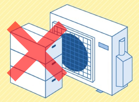 エアコンの冷房運転は、室内の空気中の熱を減らすことで部屋を涼しくしています。室内機が室内の熱を集めて、冷媒と呼ばれるガスが熱だけを室外機に運び、室外機は、背面や側面から吸い込んだ空気に熱を乗せて正面に吹き出します。 室外機の吸込口や吹出口がふさがれると、室内から運ばれてきた熱を効率的に放出できなくなってしまい、エアコンに負荷がかかってしまいます。エアコンの運転効率が下がることで、消費電力が上がり、電気代も上がります。室外機にカバーをかけたり、室外機の周辺に荷物を置いたりせず、室外機周辺の流れを妨げないようにしましょう。 また、室外機周辺が高温になった場合も、エアコンの運転効率が下がることがあります。夏場、直射日光で室外機の周辺が熱くなってしまう場合は、日影が作れて空気の通りも良い「よしず」などを、室外機から1メートルほど離れたところに立て掛けることも効果的です。