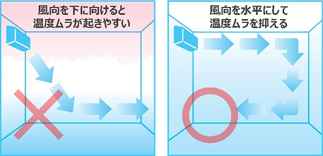 暖かい空気は上昇する性質があり、夏場の室内では、天井側と床側の空気の温度に差が出る「温度ムラ」が起こりやすくなっています。冷房運転時に温度ムラができていると、エアコンが「室内はまだ設定温度に達していない」と判断し、人が暮らす床付近は十分涼しくなっていても、必要以上に運転してしまうことがあります。快適性の低下だけでなく、エアコンへの負荷が上がり、消費電力や電気代の増加につながります。エアコンの風向を水平にしたり、扇風機などを使って室内の空気を撹拌したりするなど、温度ムラを抑える工夫をお勧めします。