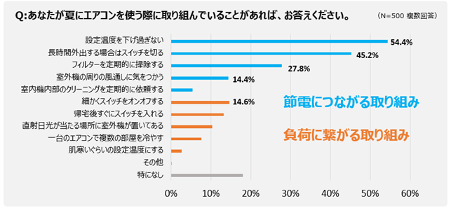 エアコンを長く安心して使用するには、試運転だけでなく上手に負荷を抑える使い方も大切です。夏にエアコンを使う際の取り組みについて質問したところ、省エネ・節電につながる取り組みを意識的に行っている方が多くいる一方で、結果的にエアコンへの負荷が上がる使い方になっている方もいるようです。