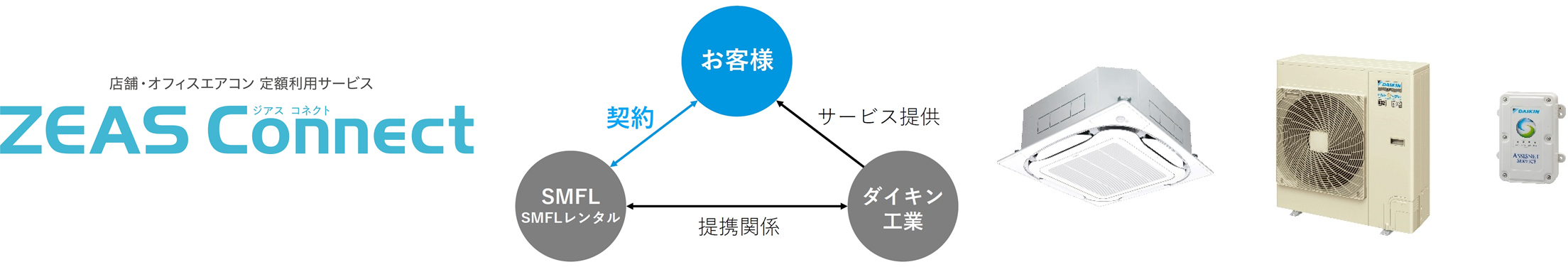 ダイキン工業株式会社(代表取締役社長兼 CEO:十河 政則、以下「ダイキン工業」)は、業務用エアコンをサブスクリプション型で提供する店舗・オフィスエアコン定額利用サービス『ZEAS Connect(ジアス コネクト)』を三井住友ファイナンス&リース株式会社(代表取締役社長:橘 正喜、以下「SMFL」)およびSMFLレンタル株式会社(代表取締役社長:原田 浩次、以下「SMFLレンタル」)と共同で開発し、2022年5月27日より提供を開始します。