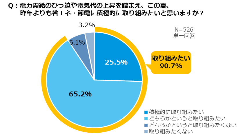 「この夏、昨年よりも省エネ・節電に取り組みたい」と回答した人は約9割(90.7%)と、大多数の人が省エネ・節電に積極的であることがわかりました。電力需給のひっ迫や、電気代の値上がりを背景に、この夏に向け、省エネ・節電に対する人々の意識は大きく高まっているようです。