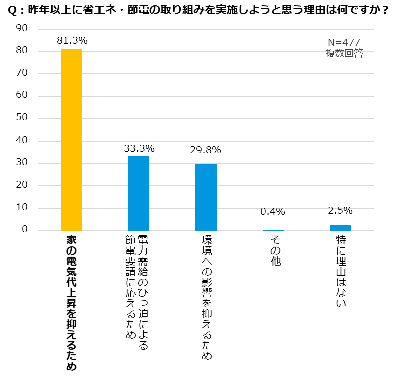 省エネ・節電に積極的に取り組む理由を聞いたところ、約8割(81.3%)の人が「家の電気代上昇を抑えるため」と回答し、他の項目を大きく抑えて最も多い結果となりました。節電要請に応えたい気持ちや、近年高まりつつある環境への意識がありつつも、現状では日常の生活と密接にかかわる「電気代の上昇」を強く意識している人が多いようです。