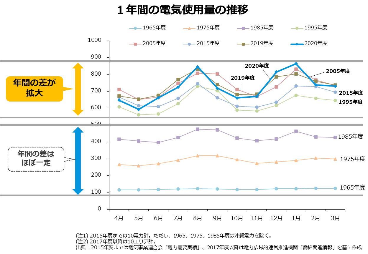 資源エネルギー庁の調査によると、夏の日中(14時ごろ)の一般家庭における電力消費は、照明や冷蔵庫を抑え、エアコンが最大(58%)で約6割を占めていると言われています。さらに、以前は、電気使用量は年間を通じてほぼ一定だったのが、近年、季節によってその差が拡大しています。夏と冬に電気使用量のピークを迎えていることから、季節によって使用頻度が大きく変わるエアコンも、夏場の電力需給に与える影響は大きいと考えられます。