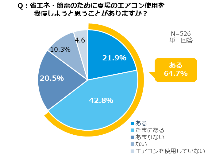 家電製品の中で、夏場の消費電力が一番大きいと多くの人に認識されているエアコンですが、電気代や環境影響等を配慮されているためか、「省エネ・節電のために夏場のエアコン使用を我慢しようと思うことがある」と回答した人は約6割(64.7%)と、半数以上にもおよぶ結果となりました。また、夏場のエアコンを使用する際に、省エネ・節電のための上手な使い方として工夫したいことを尋ねたところ、「設定温度を少し上げる(控えめにする)」と回答した人が約7割(66.3%)と最も多い回答となりました。