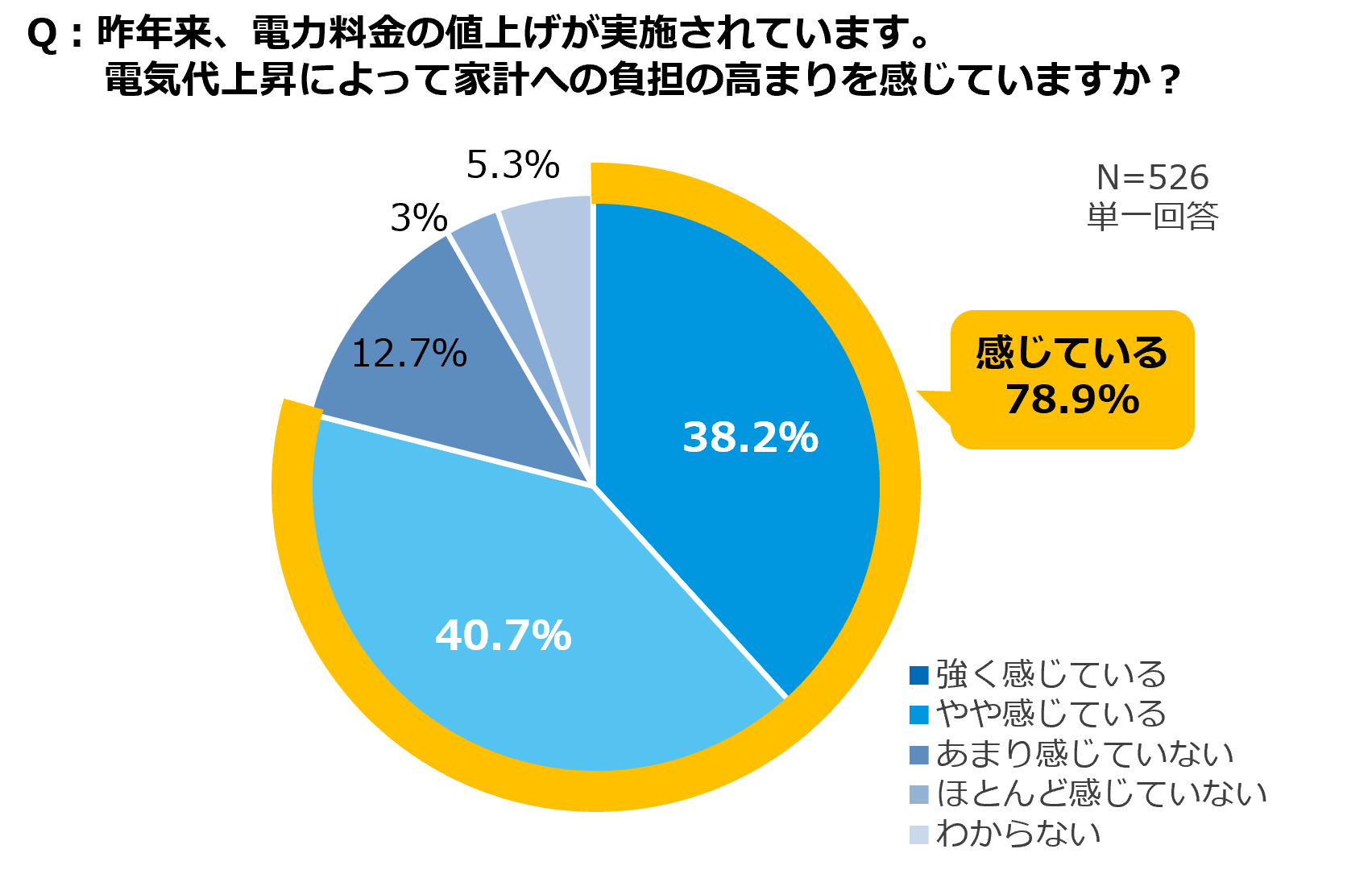 「今年の夏、電力需給がひっ迫する恐れがあることを知っていますか?」との質問に、約7割(65.8%)の人が「知っている」と回答しました。また、「電気代上昇によって家計への負担の高まりを感じていますか?」との質問には、約8割(78.9%)の人が「感じている」と回答し、多くの人がこの夏の電力需給や電気代を意識していることが明らかになりました。