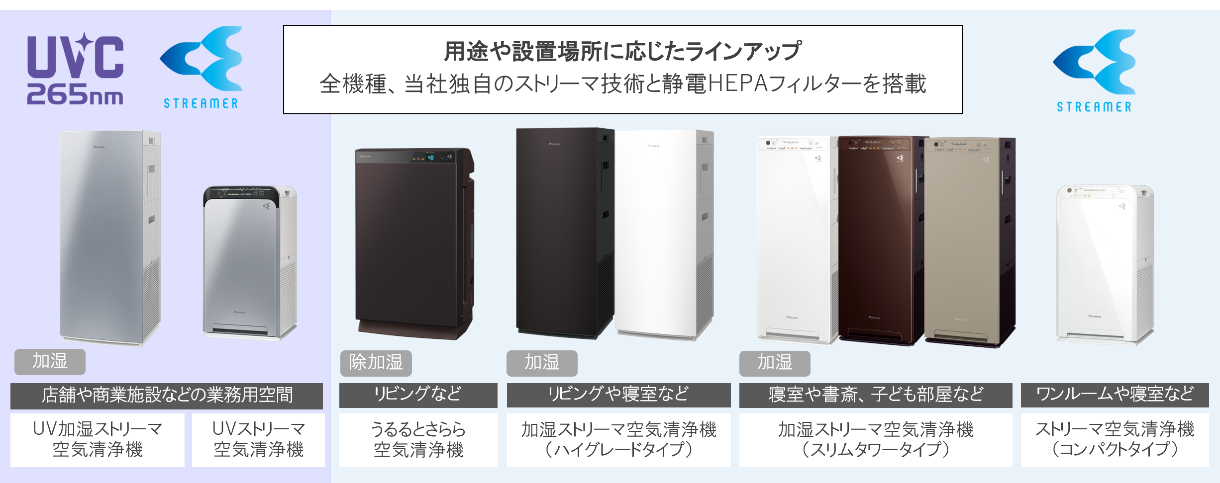 ダイキン工業株式会社は、吸込口に「抗菌※2プレフィルター」を新たに採用した業務用の『UV加湿ストリーマ空気清浄機』『UVストリーマ空気清浄機』に加え、より壁に近づけて設置しやすい「L字プラグコンセント」を採用した家庭用の『うるるとさらら空気清浄機』『加湿ストリーマ空気清浄機(2機種)』『ストリーマ空気清浄機』を10月26日より順次発売します。