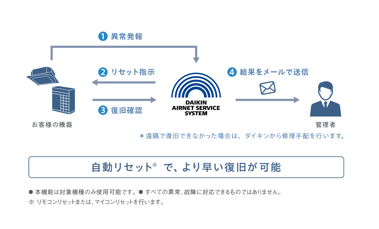 - 空調機が異常停止した時に、遠隔から自動で再起動する機能です。