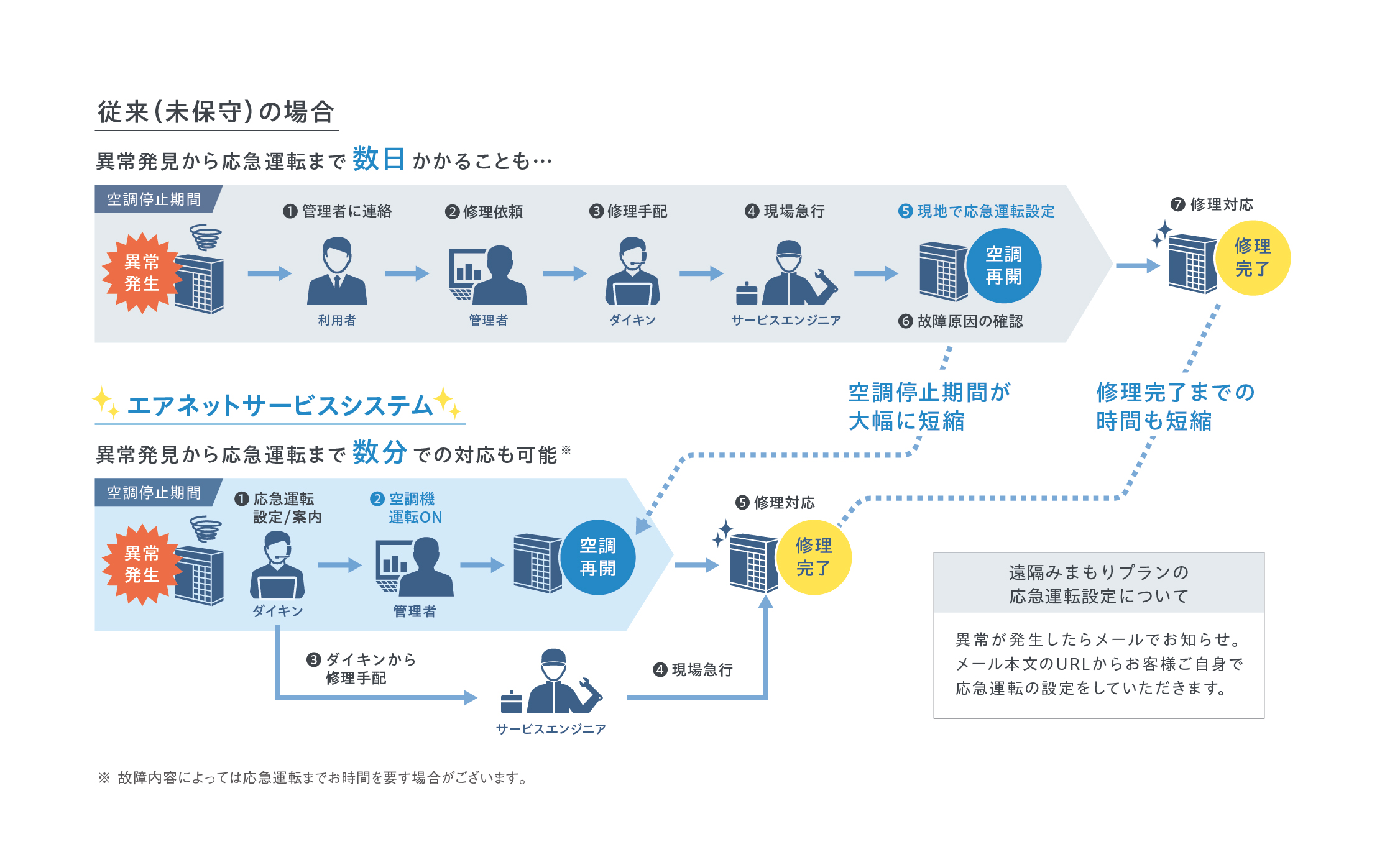 - 従来の応急運転とは違い温度センサー異常などの軽微な不具合であれば、空調能力を下げない応急運転が可能で、修理完了までお客様の快適性を維持することができます。