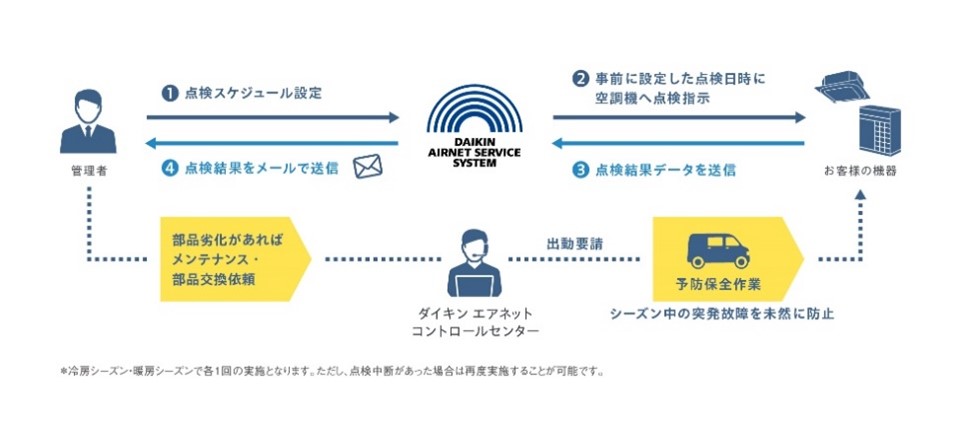 また「シーズン前遠隔点検」は、空調機の多様な状態を再現する専用の運転制御を用いた診断※2により、点検に時間を要する異常や部品の劣化などを遠隔から検出することが可能で、点検日の調整や現場立会といったお客様の負担も軽減します。さらにはこれまで検知できなかった室内機からの水漏れや電子部品の劣化などの故障予知が可能になった他、「AI故障診断」により故障部品を早期に特定できるようになりました※3。