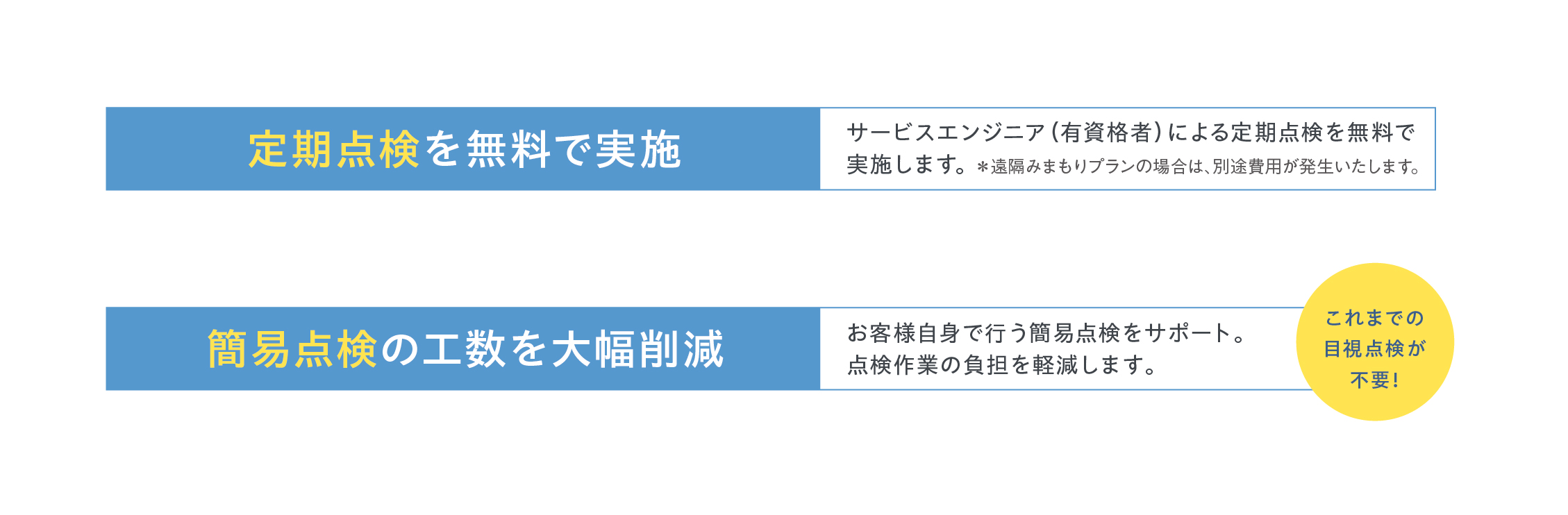 - 遠隔からの自動点検のため、点検日の調整や現場立会などのお客様の負担を軽減します。
