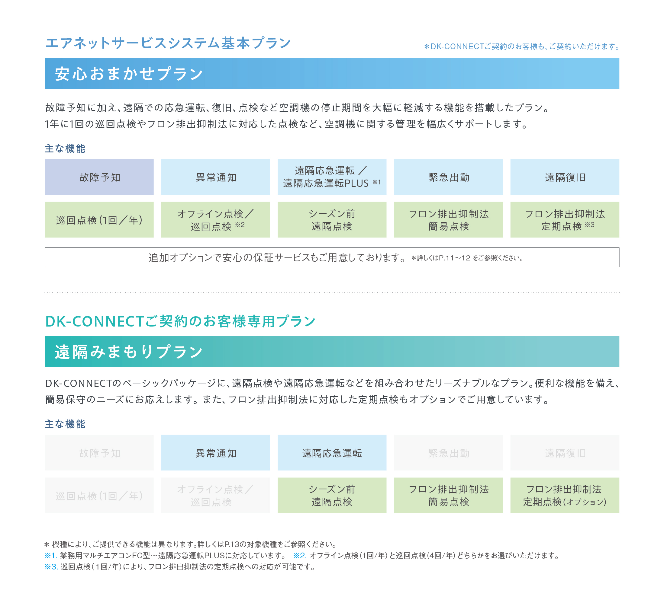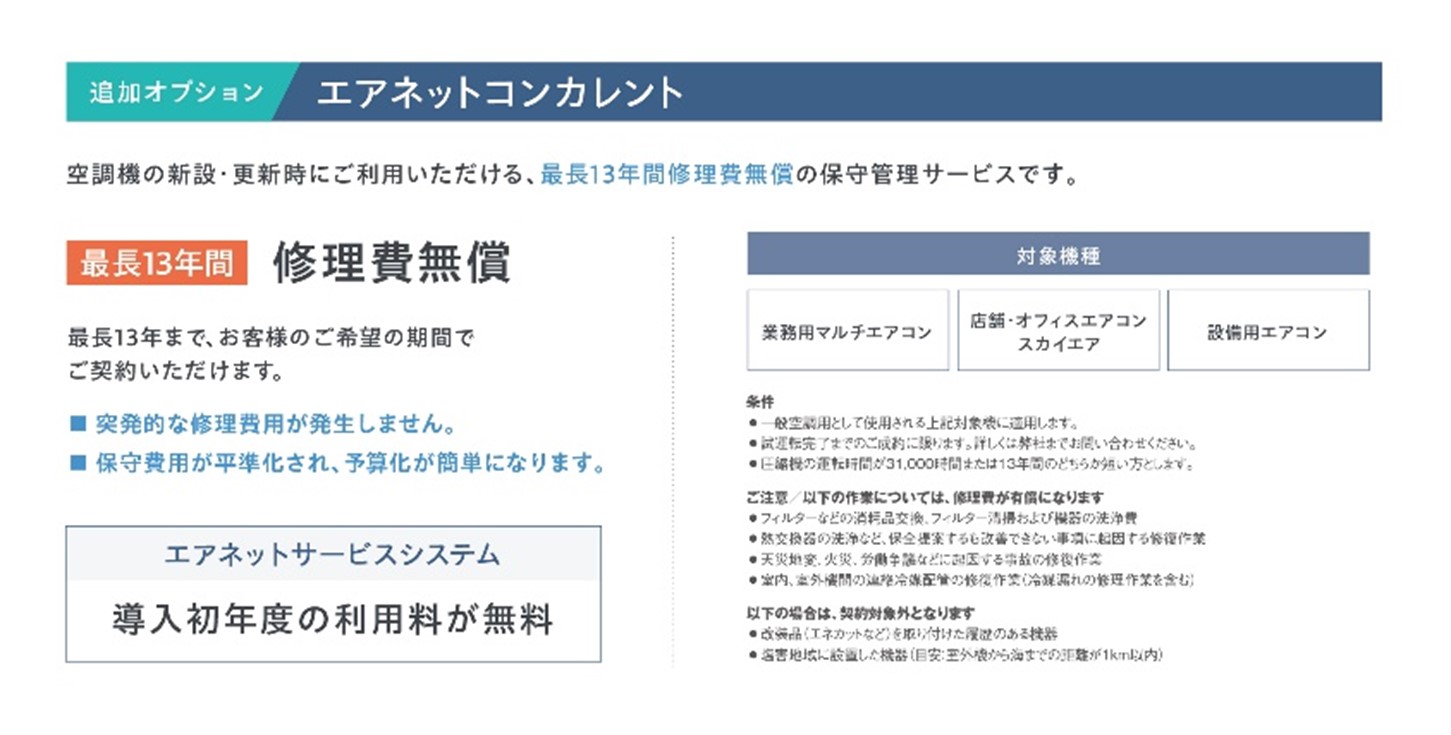 - 空調機の新設・更新と同時に『エアネットサービス』を契約することで13年または圧縮機の運転が31,000時間以内の場合に修理費用が無償になるサービスです。