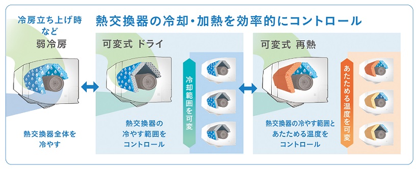 また、効率的なことも特長です。当社独自の多段階電子膨張弁により、気温や湿度に応じて必要な除湿量を小容量から大容量まで連続的(リニア)に制御することが可能です。特に、一般的に消費電力が増加しやすい再熱除湿時でも、熱交換器の温度を柔軟に調整することでエネルギーの無駄を抑えます。「さらら除湿(リニアハイブリッド方式)」は、快適性と省エネ性を両立した除湿方式です。
