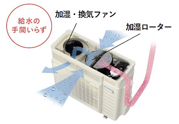 『うるさらX』の「うるる加湿」は給水せずに室内を加湿できるのが特長です。本商品では「加湿・換気ファン」の回転数を上げ、外気から水分を取り出す「加湿ローター」に、より多くの空気を通過させることで加湿量をアップしました。給気換気についても、同様の制御で換気量を向上しました。