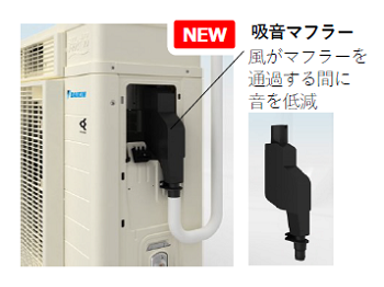「加湿・換気ファン」の回転数を上げると風切り音が増大しますが、「加湿ホース」の通風経路に「吸音マフラー」を搭載することで、室内で聞こえる音を抑えました。加湿量と換気量は増加しますが、人が感じる運転音は従来通りを維持しました。