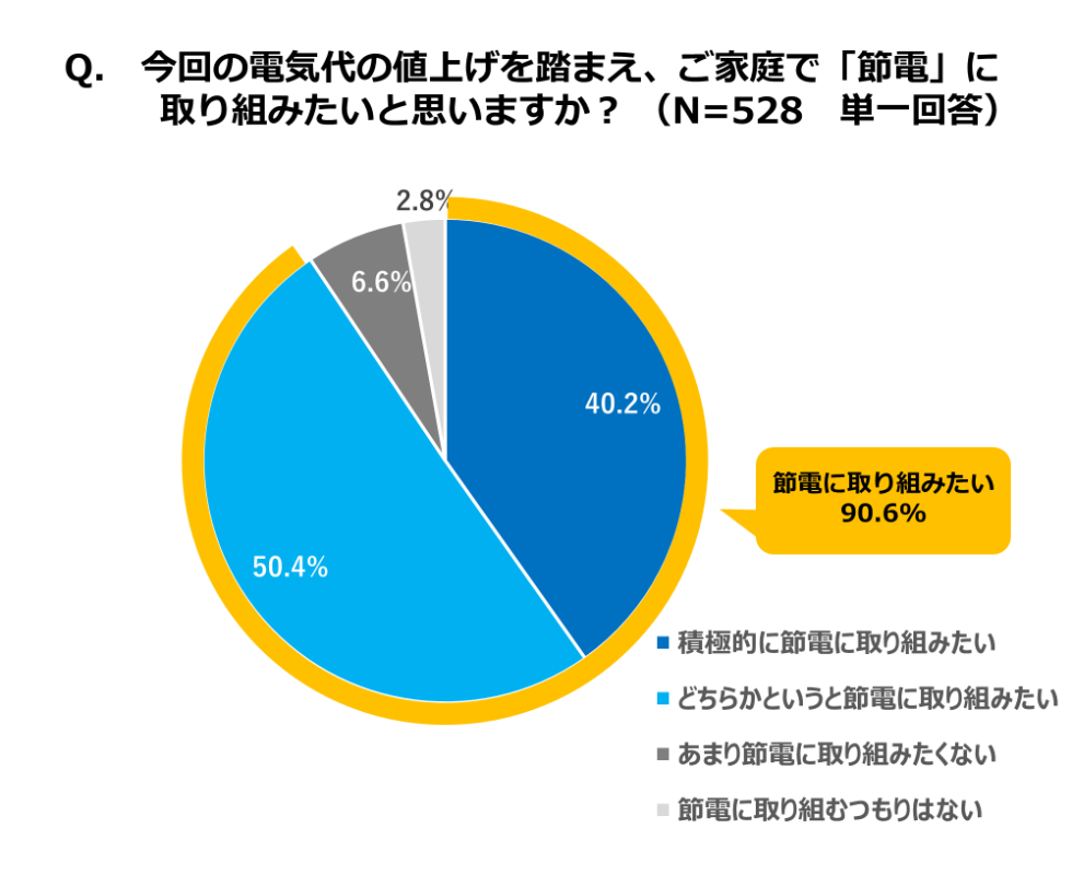 調査の結果、電気代の値上げを受けて7割以上の人がエアコンを使用することにためらいを感じ、さらにエアコンの使用自体を控えようと思っている人が過半数の6割以上もいることが判明しました。この結果を裏付けるように、電気代値上げによる家計への負担が高まると感じている方は8割を超えており、9割の方がご家庭で「節電に取り組みたい」と答えています。一方で、節電を行う上で「やり方」や「効果」がわからないといった課題も多く挙げられました。