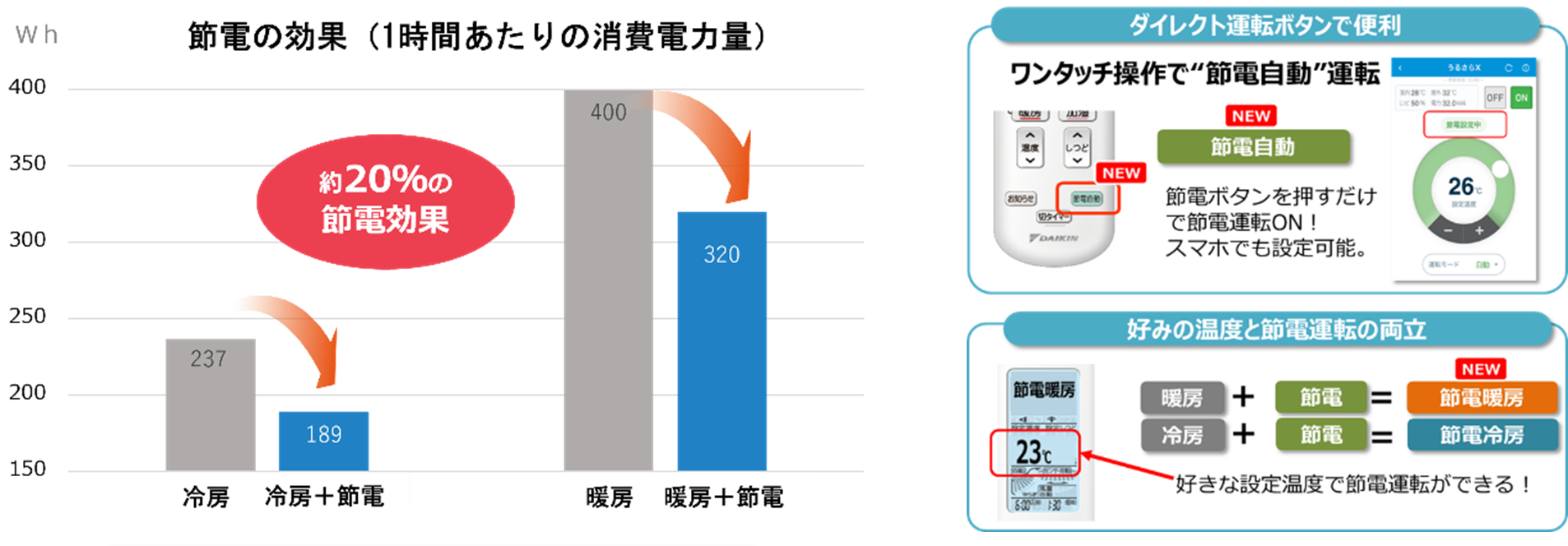 ・冷房または暖房を開始した後に「節電自動」ボタンを押すと、好みの設定温度と節電を両立。