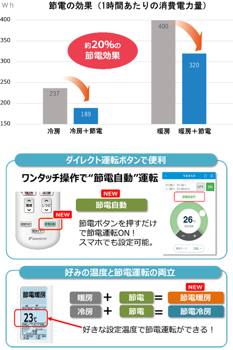 当社は、エアコンの運転時間の約80%※3を占める安定運転時(設定温度に達した後の室温を維持する運転)の節電に着目しました。本商品では、当社独自のスイングコンプレッサーを活用し、安定運転時の消費電力量を約20%削減※4する「節電自動」を新たに搭載します。「節電自動」ボタンを押してエアコンを起動すると、外気温に応じた設定温度をエアコンが自動的に判断し、節電につながる冷房運転や暖房運転を行います。また、通常の冷房運転または暖房運転を開始した後に「節電自動」ボタンを押せば、好みの設定温度で節電することも可能です。快適性の向上を目指す従来からの「AI快適自動」に加えて、効率的な運転を優先する「節電自動」を搭載し、多様な選択肢を提供します。