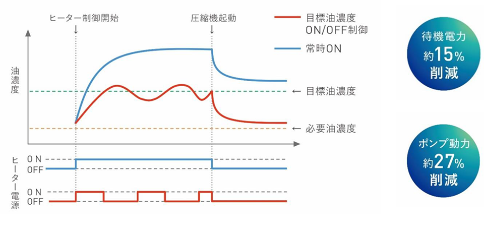 さらに従来は圧縮機停止時に常時通電しているクランクケースヒータを目標油温に合わせて温度制御することにより、待機電力を抑制しました。さらに水圧損失の小さい新型の水熱交換機の採用によるポンプ動力の低減などにより、冷却IPLVに表れない部分でも、チラー本体の省エネ性も向上させました。