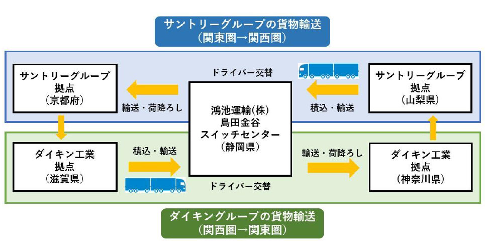 サントリーの拠点(山梨県)から関西方面への製品輸送と、ダイキンの拠点(滋賀県)から関東方面への製品輸送においてダブル連結トラックを活用します。鴻池運輸の島田金谷スイッチセンター営業所(静岡県)を発着地としてドライバーを交替します。