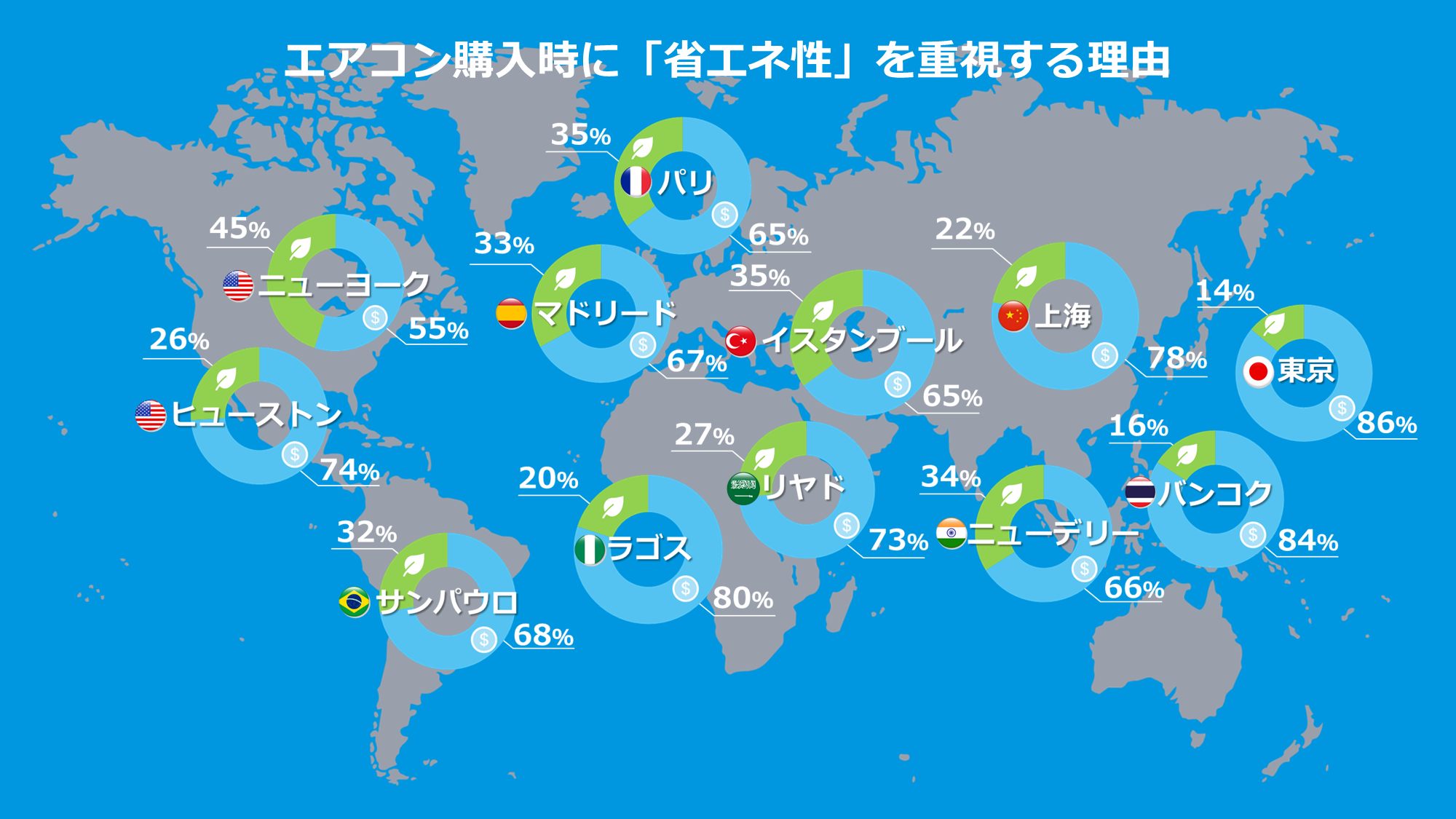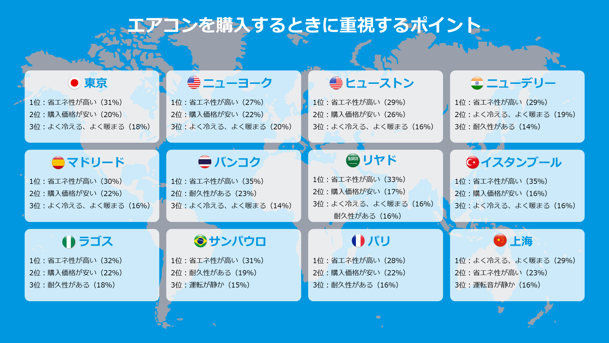 また、ニューヨーク(アメリカ)、ヒューストン(アメリカ)、パリ(フランス)、マドリード(スペイン)では「購入価格が安い」の割合が「省エネ性」と同様に高く差が10%未満)、エアコンの電気代と初期費用の両方が重視されるようです。一方、サンパウロ(ブラジル)、バンコク(タイ)、ニューデリー(インド)、上海(中国)では購入価格の重要度は他都市より低いようです。